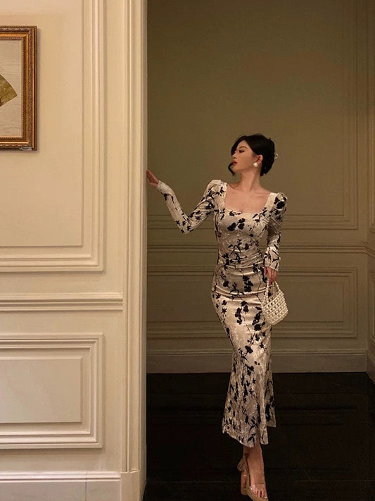 Sexy Sheath Black Floral Velvet Long Sleeves Prom Dresses Birthday Outfits SD310