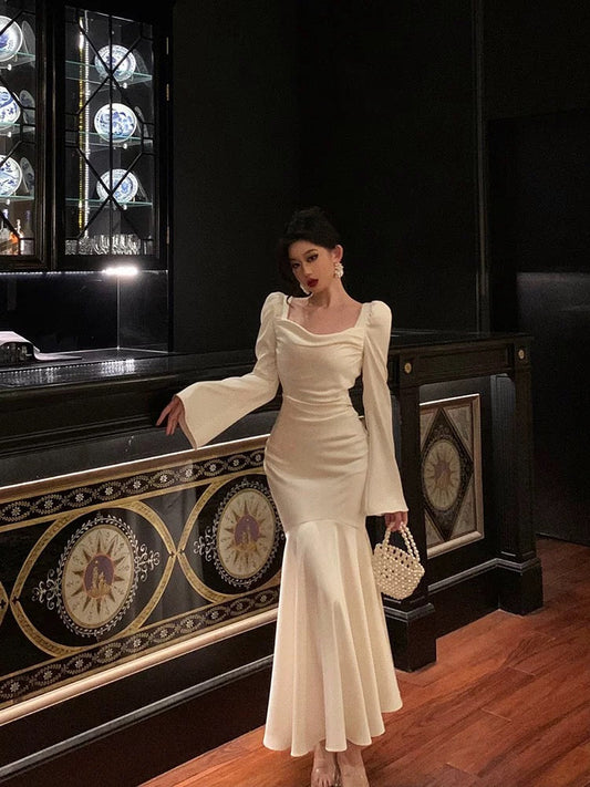 Sexy French Sheath Square Neckline Ivory Long Sleeves Prom Dresses Birthday Outfits Evening Gown SD1057