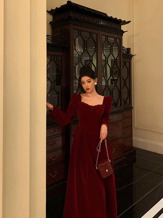 Sexy A line Square Neckline Long Sleeves Tea Length Velvet Prom Dresses Birthday Outfits SD686