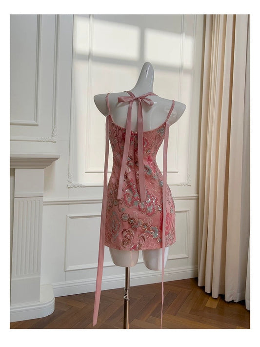 Pretty Sheath Spaghetti Straps Pink Sequin Summer 16th Birthday Dresses For Teens Hoco Dress Mini 18th Birthday Outfit Cocktail Dresses For Women W907