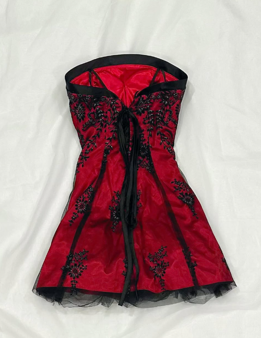 Black Appliques A Line Strapless Black Tulle Burgundy Satin Short Homecoming Dress Birthday Dress Outfits SH3540