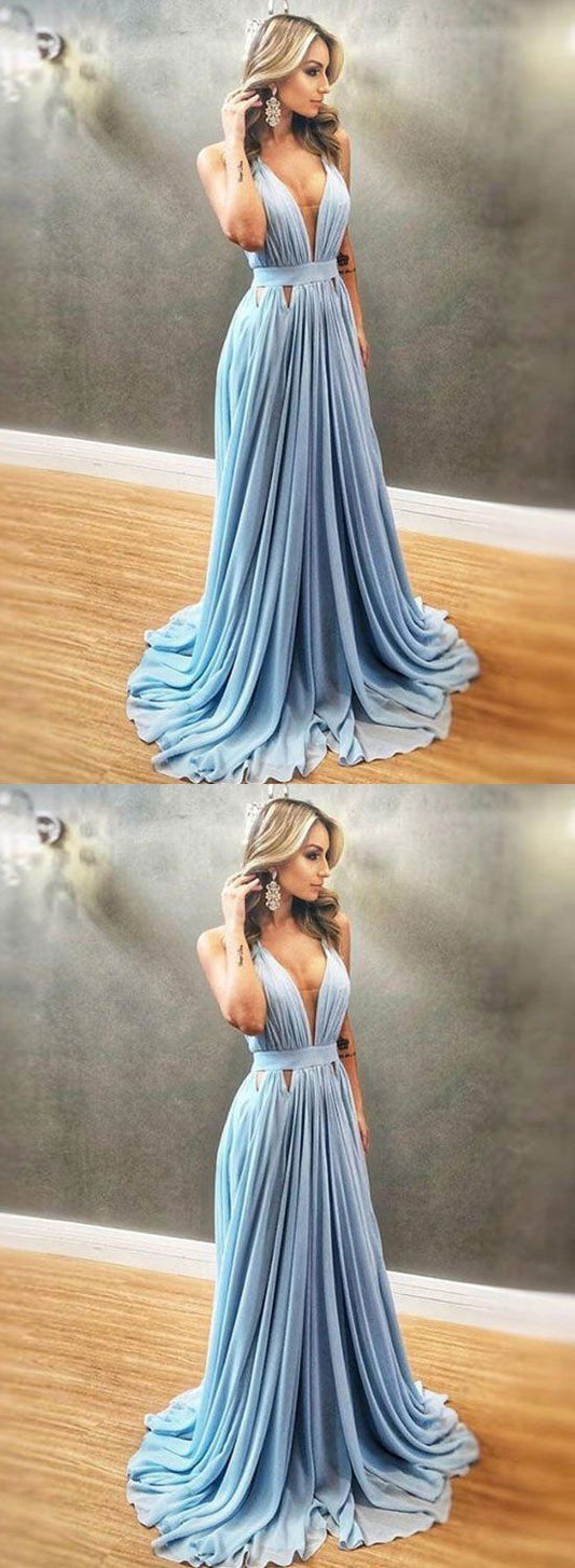 Simple blue chiffon v neck long prom dress, blue evening dress cg1825