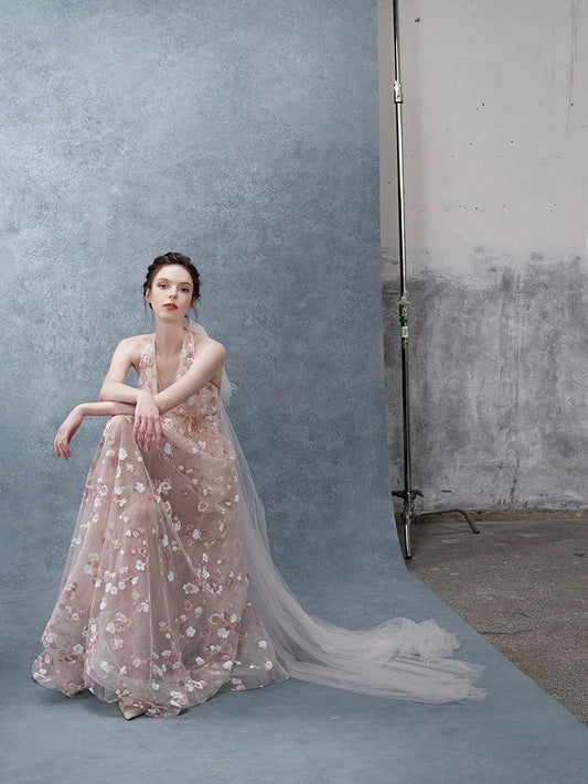 Classy A Line Halter Pink Floral Evening Dress Long Prom Dresses H2882