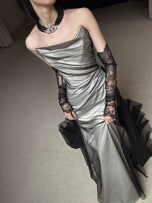 Classy Mermaid Strapless Black Girls Satin Long Prom Dresses Party Dress Birthday Outfits Graduation Dresses W0510