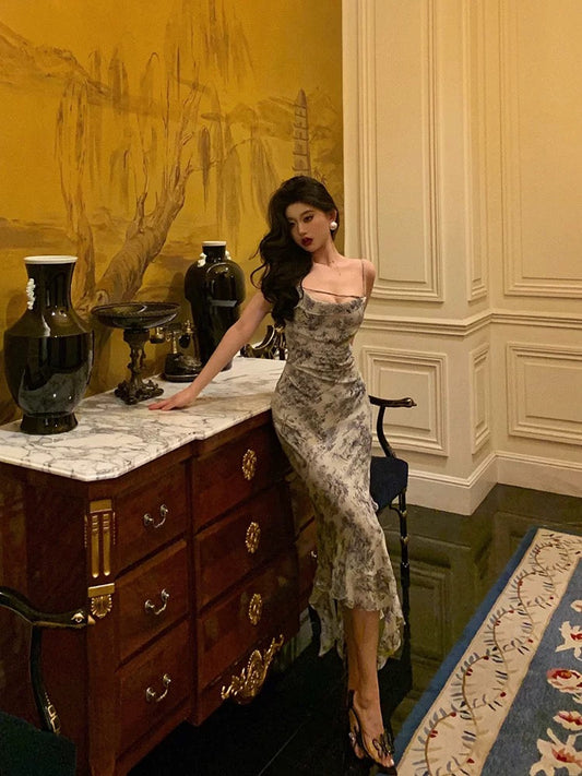 Sexy Sheath Spaghetti Straps Blue Floral Prom Dresses Birthday Outfits Evening Gown SD956