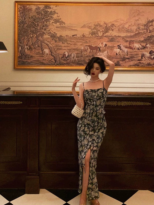 Sexy Sheath Spaghetti Straps Floral Blue Chiffon Prom Dresses Birthday Outfit SD705