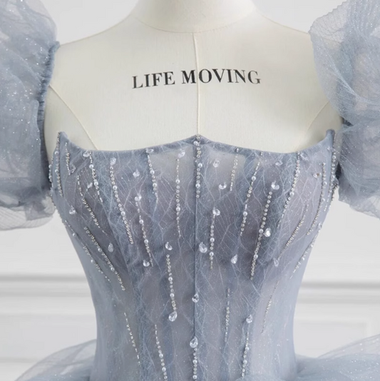 Gray blue beads long prom dress gray tulle formal dress ED0823