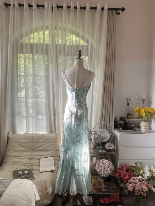 Light Blue Beaded Tulle Spaghetti Straps Prom Dress ED01309