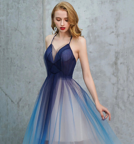 Blue v neck tulle long prom dress, blue evening dress fg2502