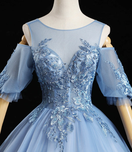 Blue Tulle Ball Gown Long Sweet 16 Dress With Lace Applique, Prom Dress gh251