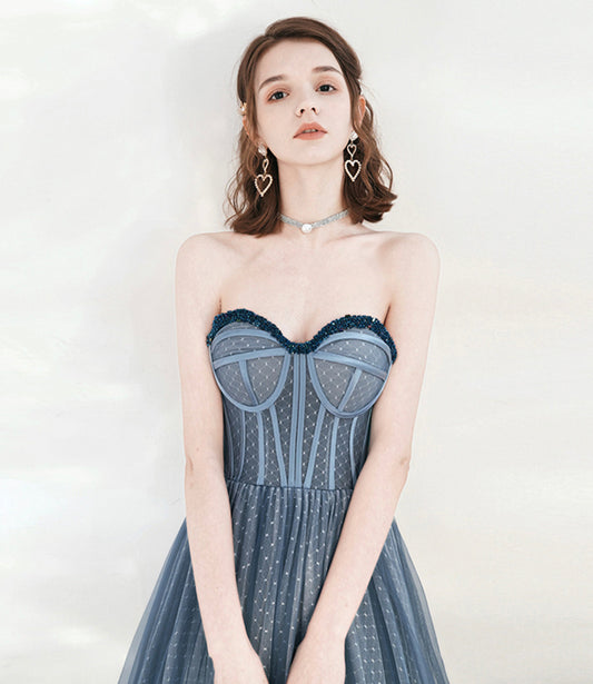 Blue Tulle Beaded Sweetheart Unique Long Prom Dress, Blue Evening Dress Formal Dress gh103