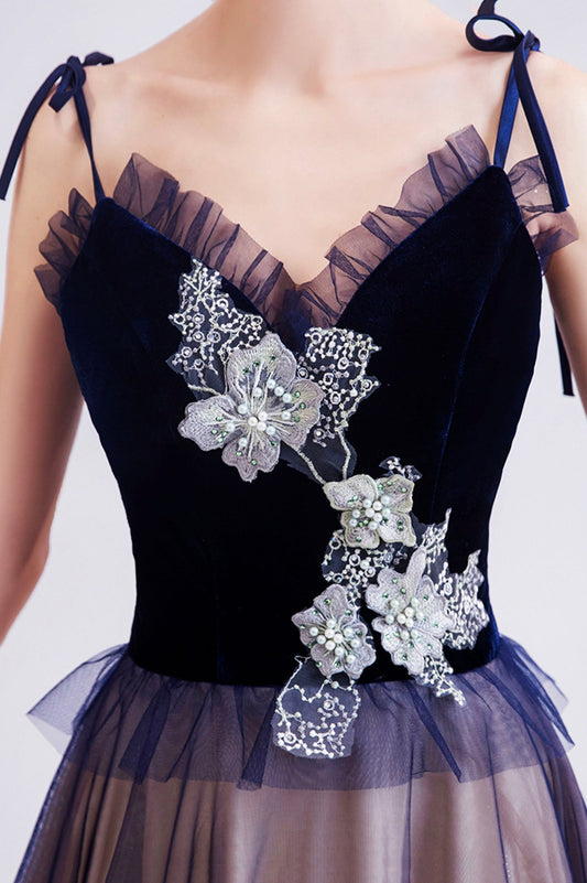 Blue tulle lace long prom dress A line formal dresses 10455