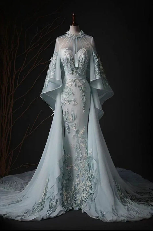 Blue Gorgeous Retro Fashion Elegant Floral Appliqué A-Line Long Tulle Floor-Length Tail Evening Dress Prom Dress gh3699