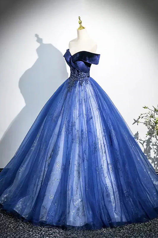 Blue A-Line Velvet Tulle Long Prom Dress, Elegant Off the Shoulder Party Dress ED0998