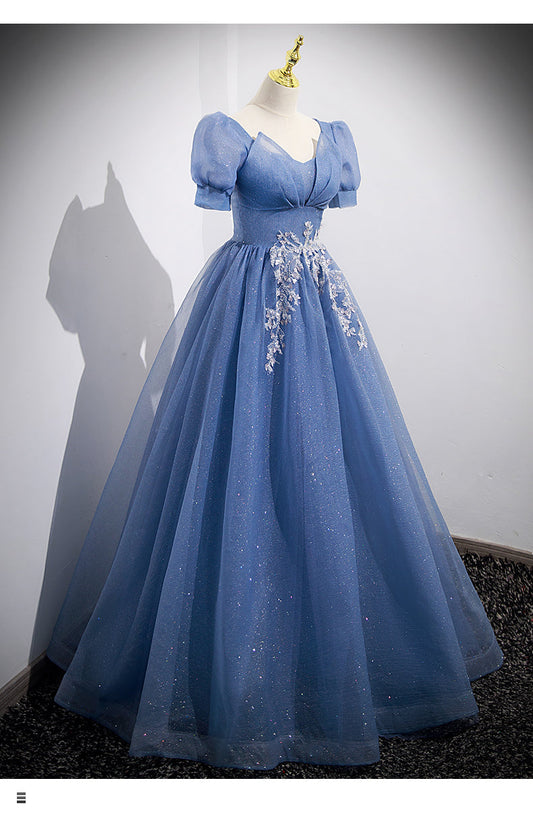 Ball Gown Short Sleeves Long Tulle Blue Prom Dresses SH035