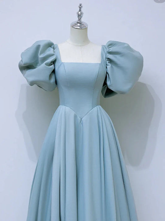 A-Line Puff Sleeves Satin Peacock Blue Long Prom Dress, Peacock Blue Long Formal Dress ED0588