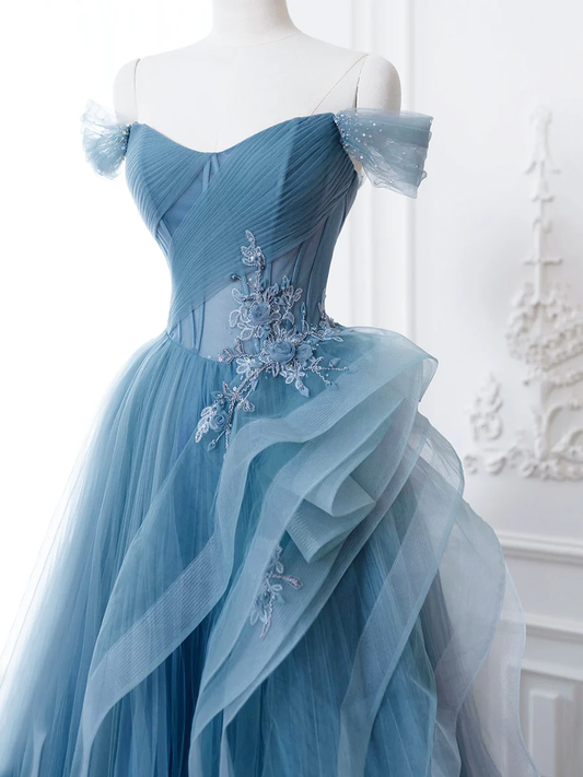 A-Line Off-the-Shoulder Sweetheart Sweep Train Tulle Prom Dress, Sky Blue Applique Wedding Dress ED01621