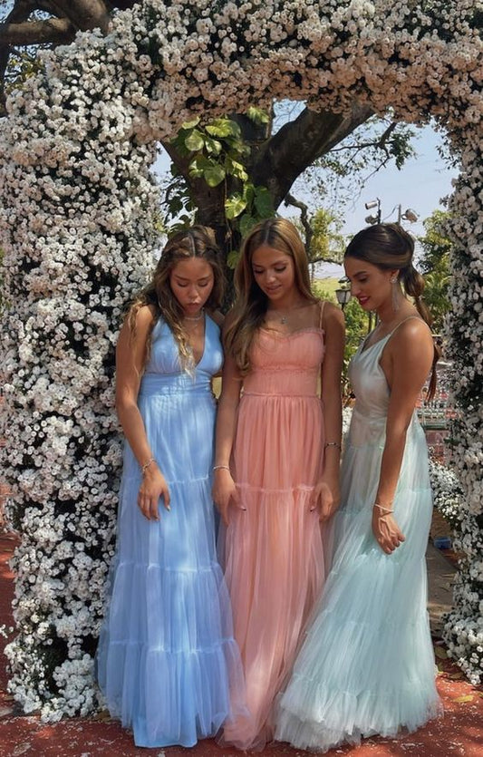 Simple A line Light Sky Blue Tulle Long Prom Dress P1638