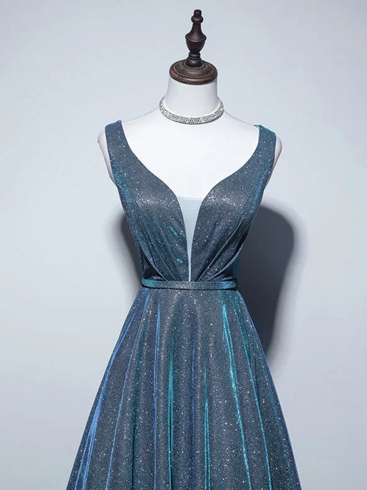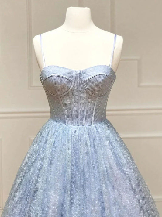 Shiny A-Line Tulle Blue Long Prom Dress, Blue Formal Evening Dresses ED0779