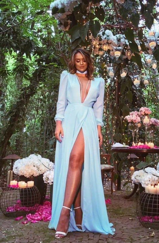 Simple A Line V Neckline Light Sky Blue Long Sleeves Chiffon Prom Dresses P1779