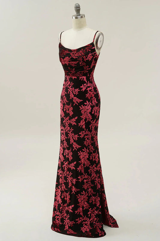 Vintage Mermaid Spaghetti Straps Burgundy Printed Velvet Long Prom Dress with Slit SH1921