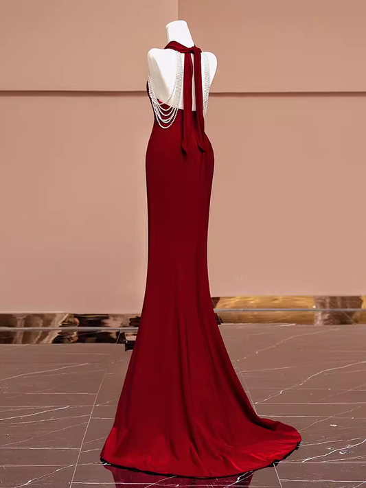Mermaid Halter Burgundy Long Prom Dresses P1914