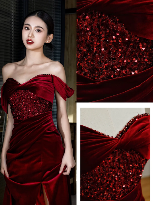 Elegant Glamour Mermaid Off The Shoulder Burgundy Velvet Long Prom Dresses Party Dress Evening Dress DP1560
