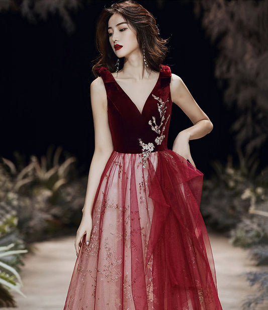 Burgundy Vintage Shiny Fashion Stunning Elegant Long Chiffon Tulle Cute Sweet Prom Dress Evening Gown Birthday Party Dress Prom Dress Graduation Dress gh3886
