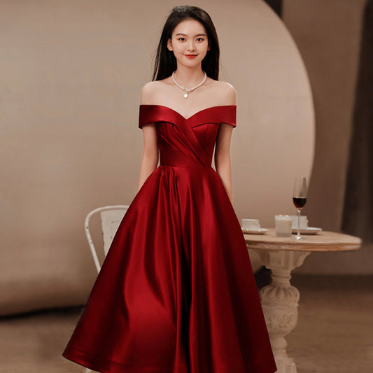 Burgundy satin tulle long prom dress A line evenig dress 10383
