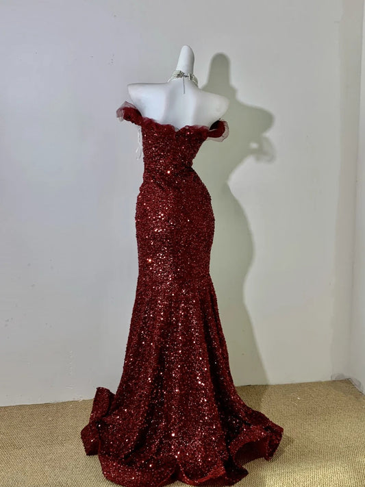 Burgundy prom dresses sparkly long sleeve off the shoulder feather mermaid prom gown fg1622