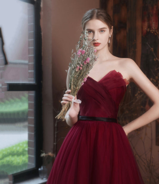 A-Line Burgundy Tulle Long Prom Dress, Burgundy Long Evening Dress ED0660