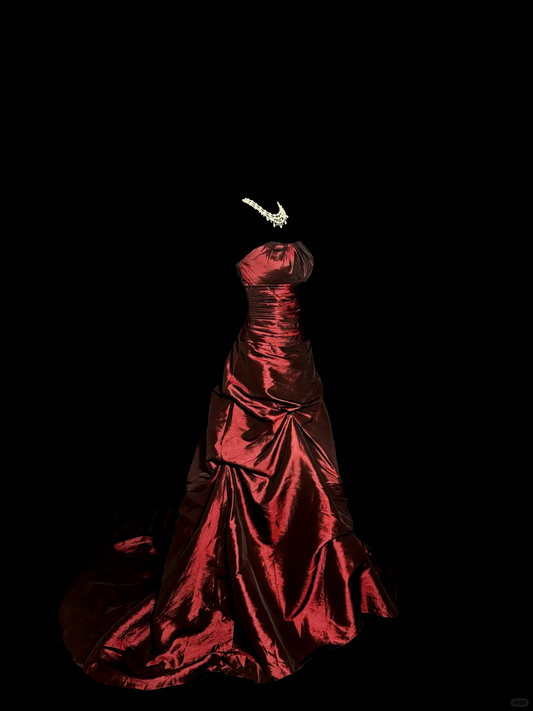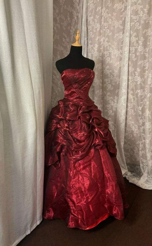 Aesthetic Ball Gown Strapless Burgundy Taffeta Prom Dress Ruffle Long Party Dress SD2942