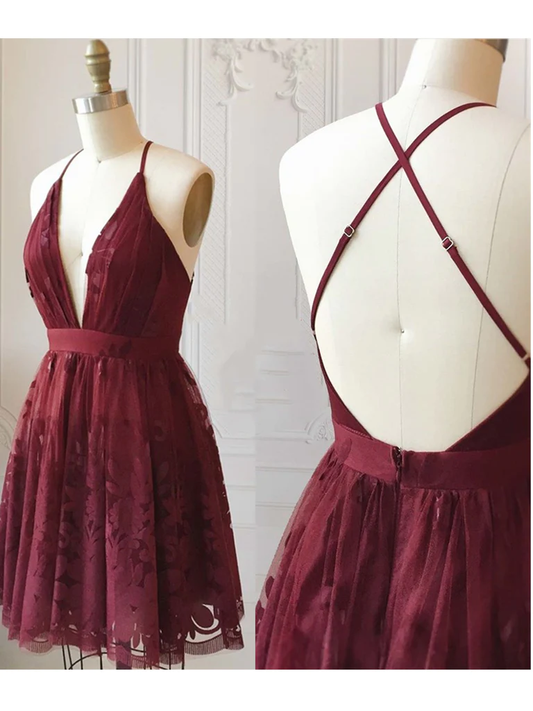 A Line V Neck Short Burgundy Lace Prom Dresses, Short Burgundy Lace Formal Homecoming Dresses gh1740