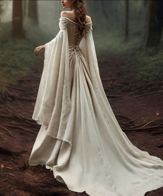 Vintage Off The Shoulder Wedding Dress with Cape Lace Up Lace Applique Bridal Dress fg7469
