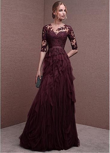 Gray purple elegant long sleeve lace long tulle ball gown evening dress 7648