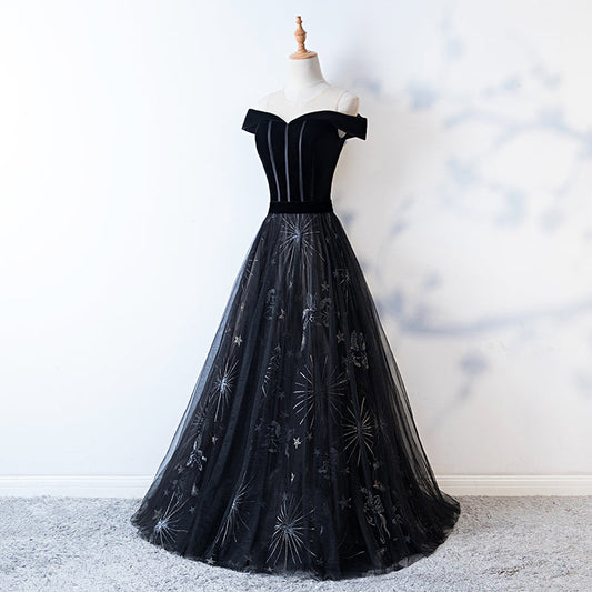 Black tulle off shoulder long prom dress, black evening dress 7899