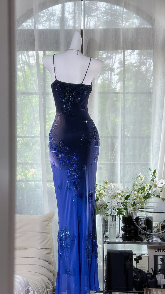 Dark Blue Floral Beaded Elegant Spaghetti Strap Long Chiffon Prom Dress Evening Dress Party Dress Date Dress gh5083