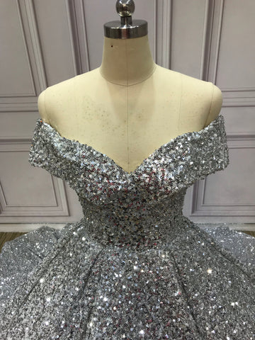 Silver Gorgeous Shiny Off-shoulder Sequin Long Princess Floor-length Ball Gown Evening Dress Wedding Dress gh3445