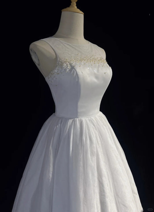 White Simple Fashionable Elegant Understated Exquisite Applique Long Floor Length Satin Ball Dress Evening Dress Wedding Dress gh3862