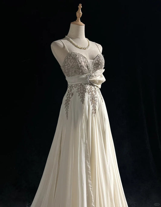 Ivory White Vintage Fashion Elegant Delicate Lace Beading Spaghetti Strap Long Satin Evening Gown Ball Gown Prom Dress Party Dress gh3814