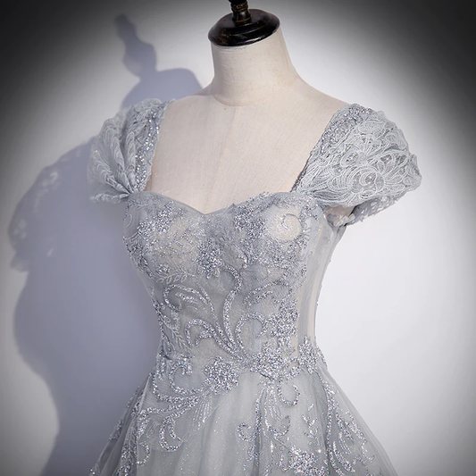 Grey Sweetheart Lace And Tulle A-Line Evening Dress, Light Grey Prom Dress gh54