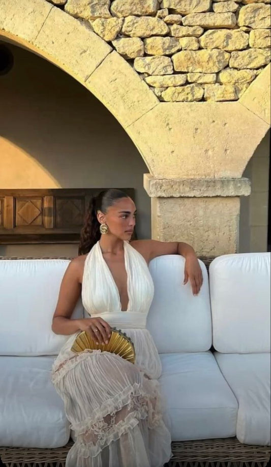 White Elegant Strap Ruffled Long Chiffon Prom Evening Dress Wedding Guest Dress gh3052