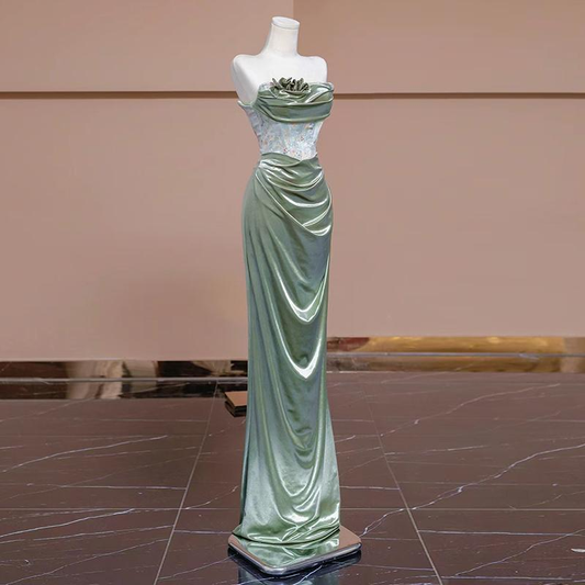 Sexy A line Strapless Green Satin Long Prom Dresses Formal Summer Wedding Guest Dresses Wedding Guest Outfit W0173