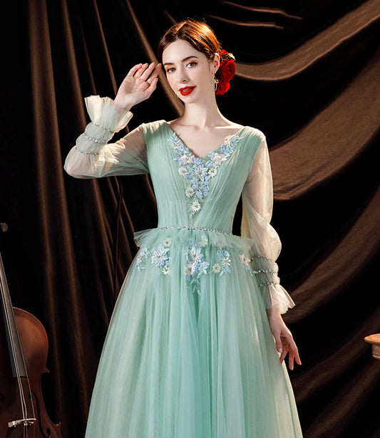 Green tulle lace long prom dress A line evening dress 10379