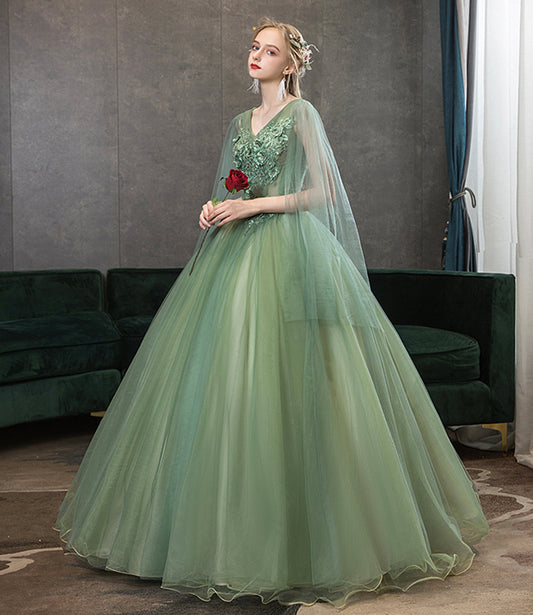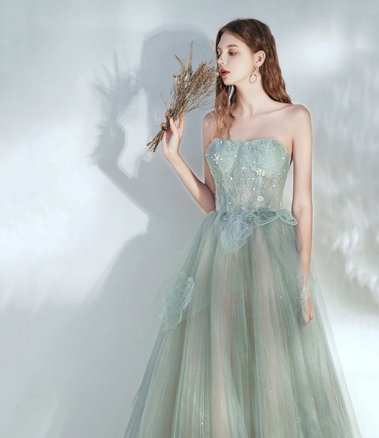 Green tulle lace long prom dress A line formal dress 10459