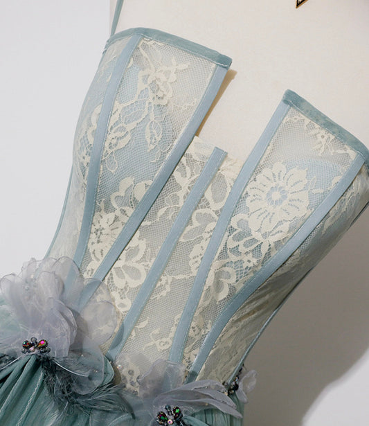 Green tulle lace long prom dress, evening dress 8043