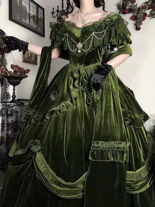 Green Exquisite Ball Gown Off the Shoulder Velvet Long Party Dress Prom Dress SH3594
