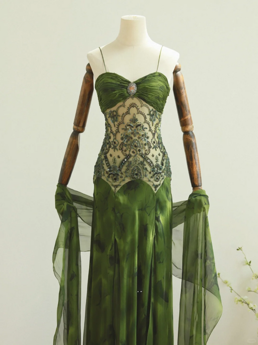 Green A Line Spaghetti Strap Beaded Chiffon Prom Dress 18th Birthday Dress SH3898