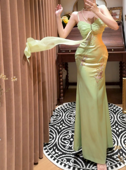 Gentle Green Sheath Spaghetti Strap Appliques Satin Chiffon Prom Dress Evening Dress SH2668