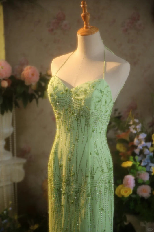Fresh Green Beaded Sequined Chiffon Irregular Fishtail Prom Dress P3387